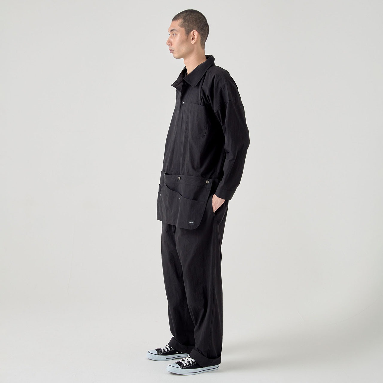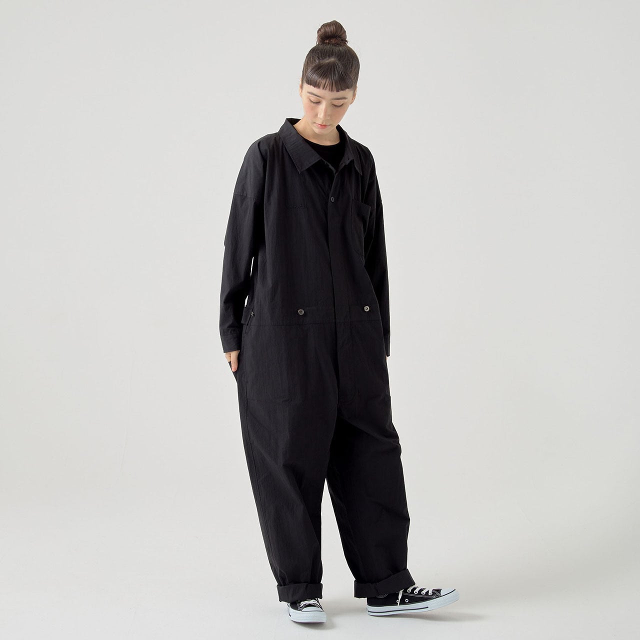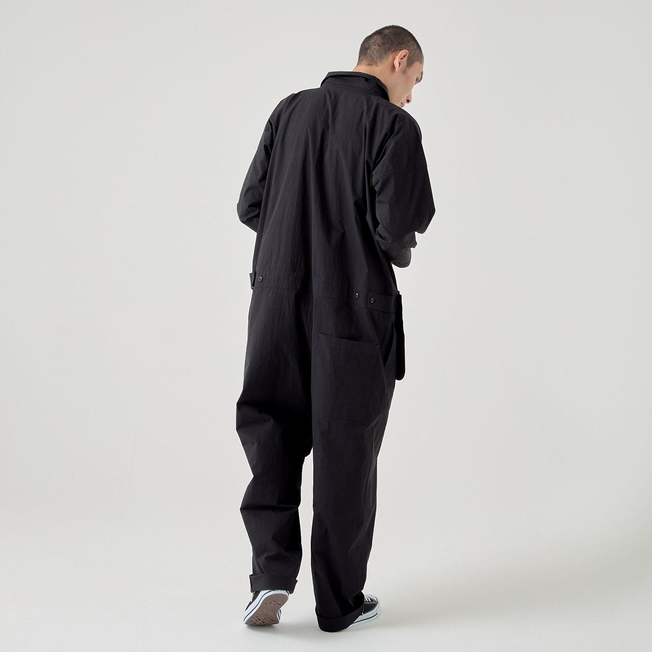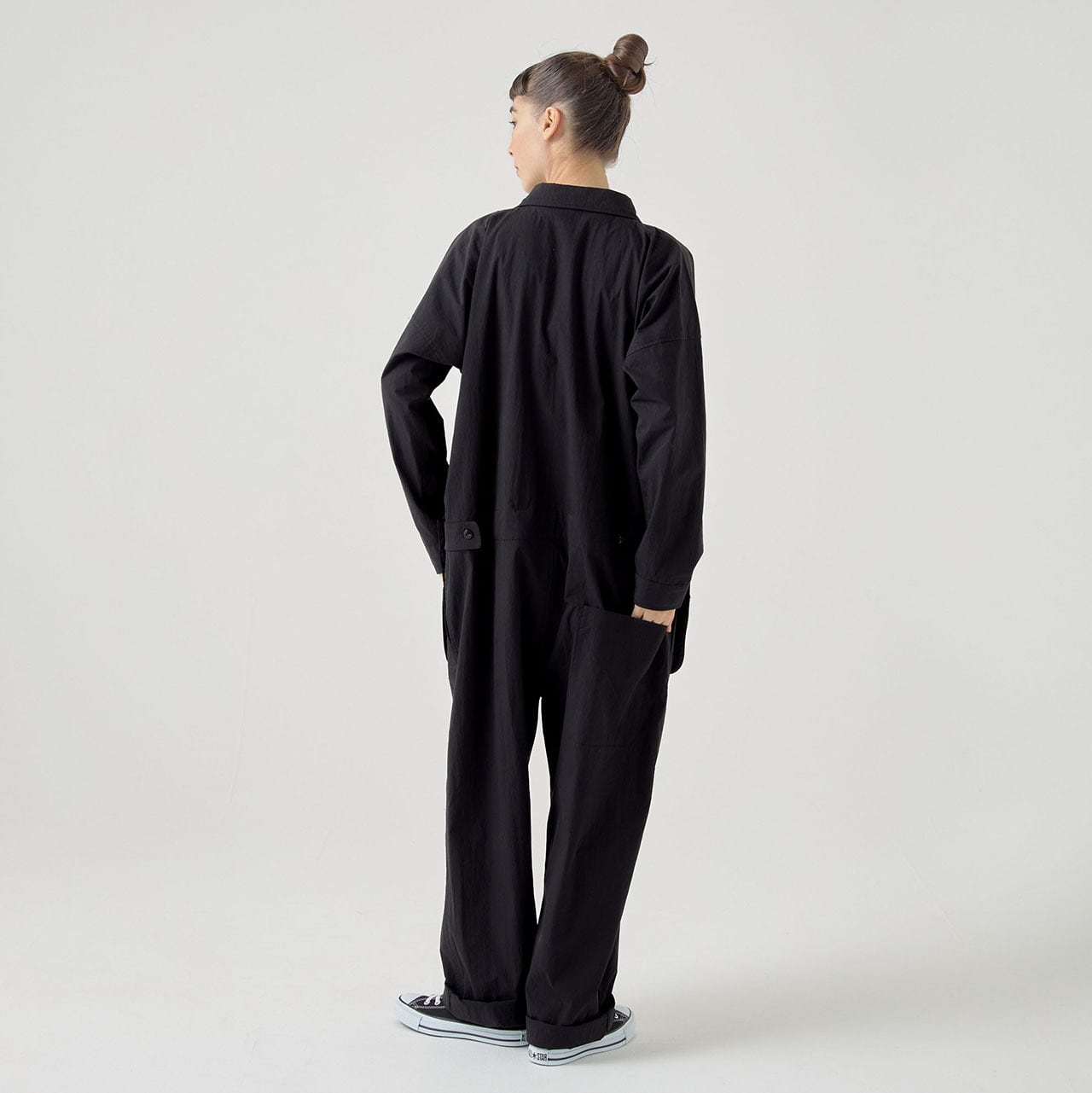 白いツナギと同様にビッグシルエットで着こなしの美しいラインにこだわった長袖ツナギのブラック。素材は綿30%・ナイロン70%で適度なシャリ感と張り感がありシルエットを美しく見せてくれます。