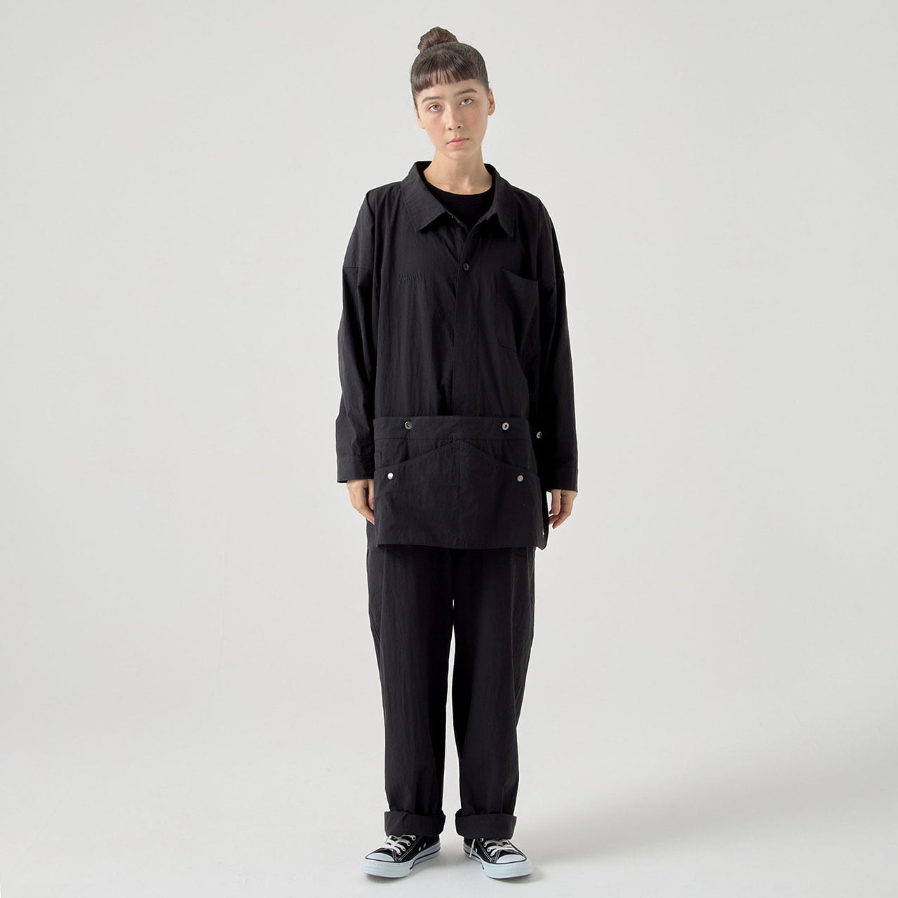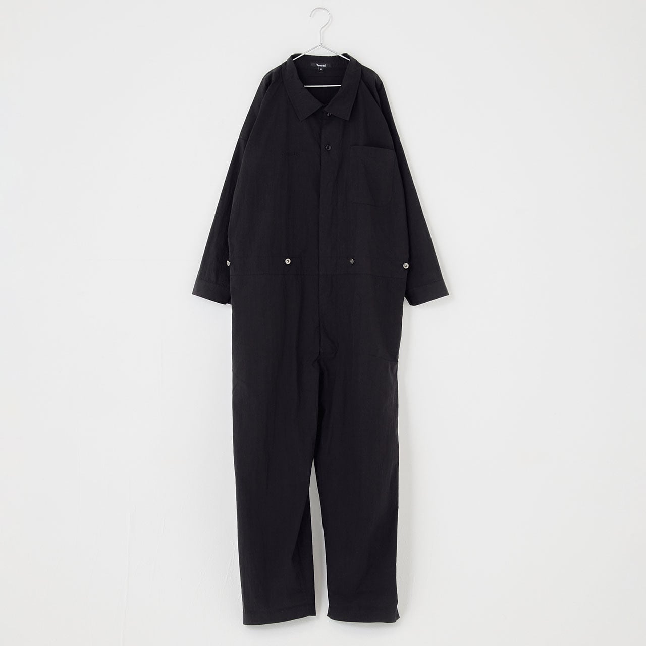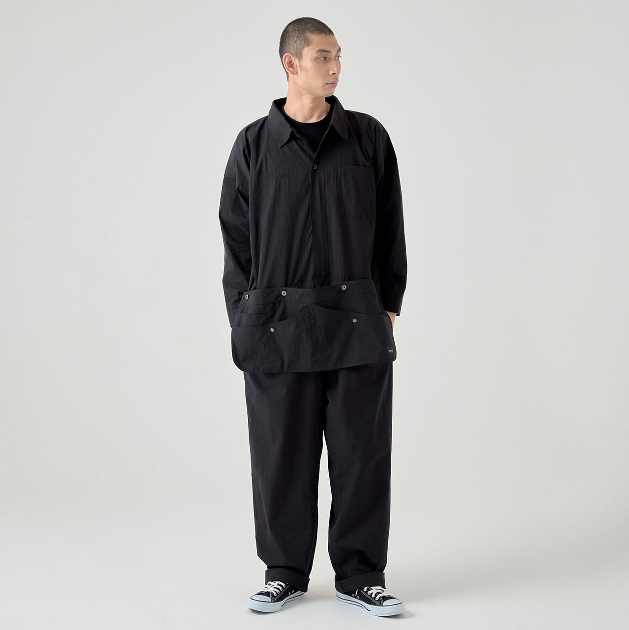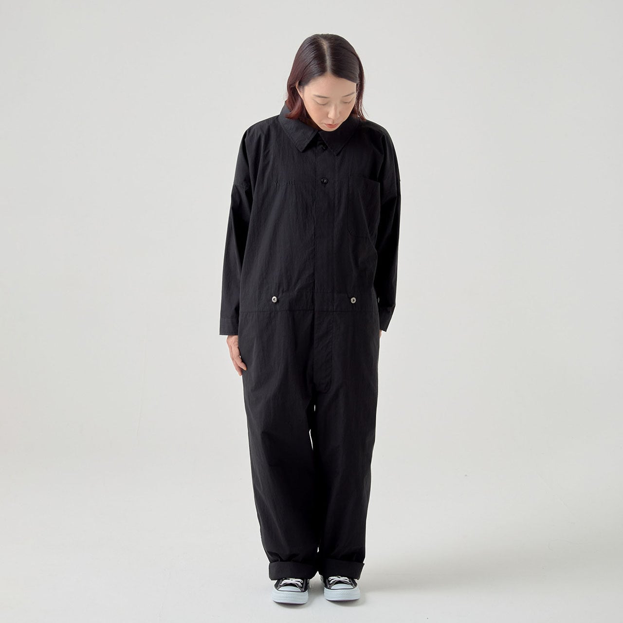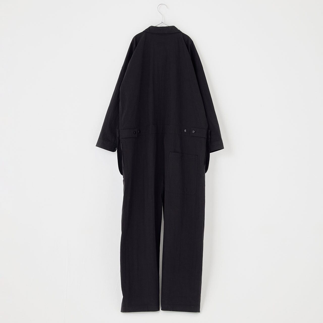 白いツナギと同様にビッグシルエットで着こなしの美しいラインにこだわった長袖ツナギのブラック。素材は綿30%・ナイロン70%で適度なシャリ感と張り感がありシルエットを美しく見せてくれます。