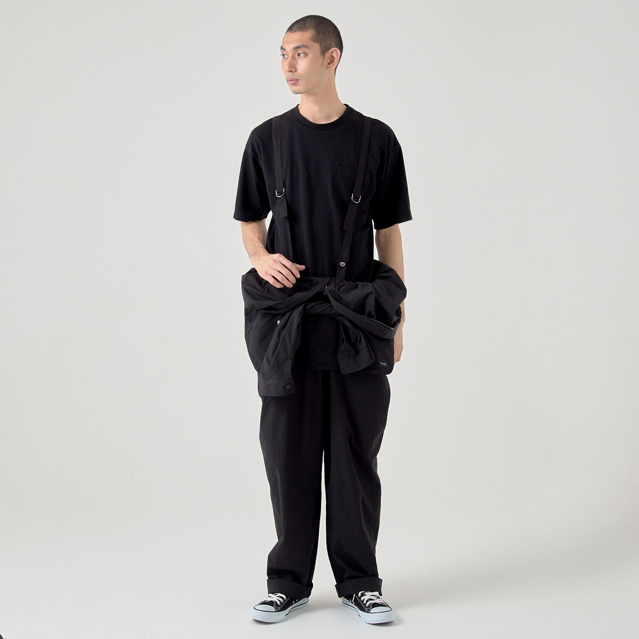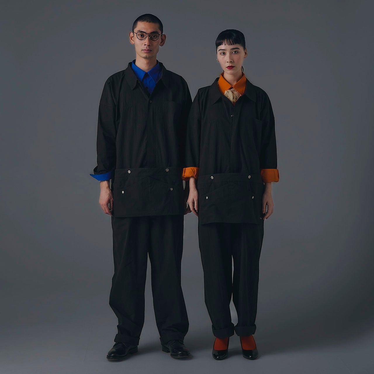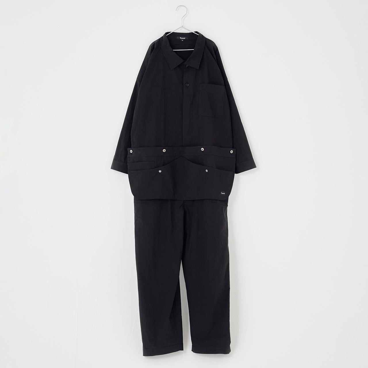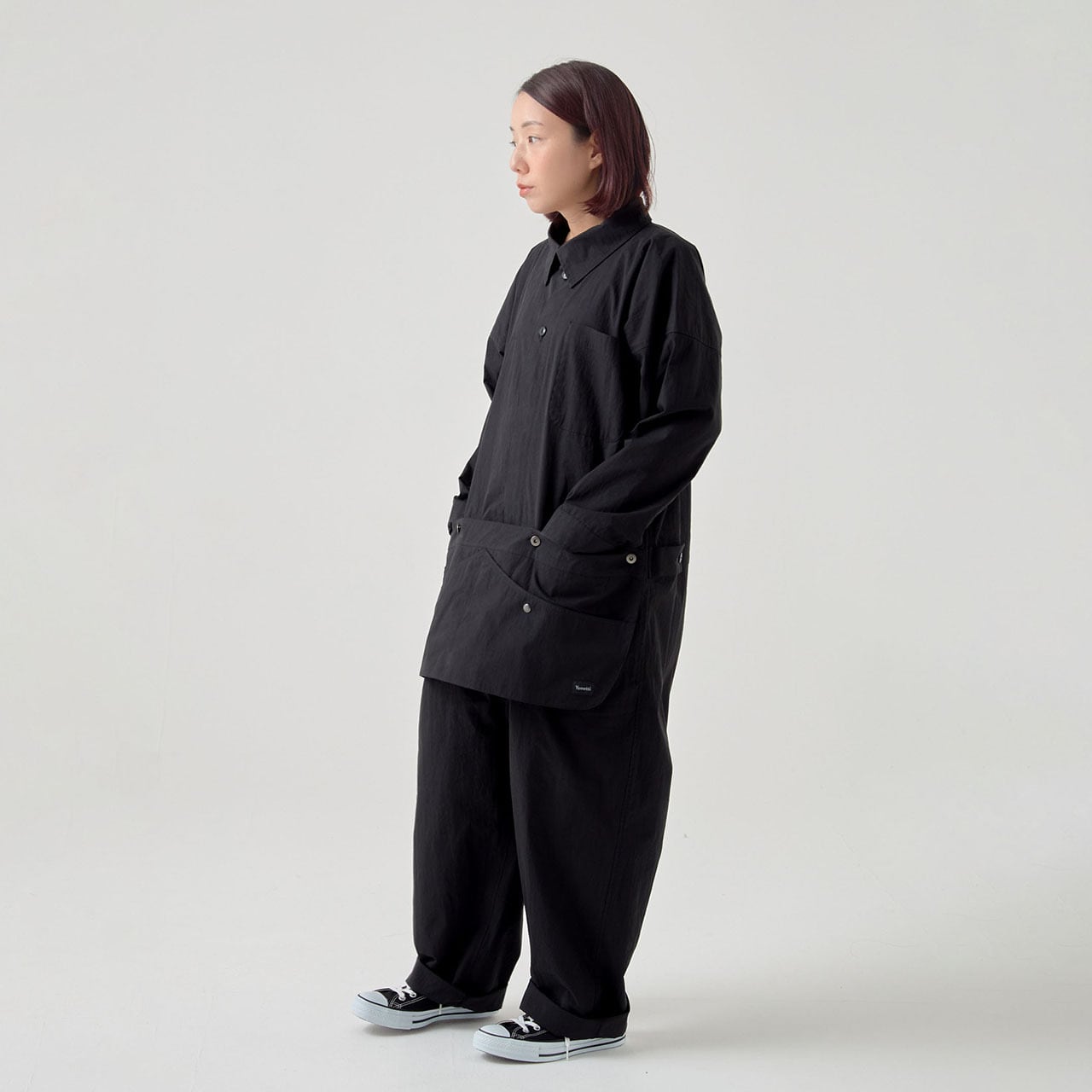 白いツナギと同様にビッグシルエットで着こなしの美しいラインにこだわった長袖ツナギのブラック。素材は綿30%・ナイロン70%で適度なシャリ感と張り感がありシルエットを美しく見せてくれます。